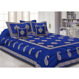 Royal Blue Paisly Border Hand Block Print Bedsheet Set, Handmade Indian Silk Bedding Set, Bedroom Decor, Khadi Golden Hand Block Work Silk Double Bedspread