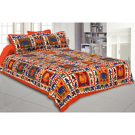 Orange Border Elephant HandBlock Print Bedspread, Rajasthani Traditional Collection Design, Elephant Pattern Screen Print Double Bed Sheet