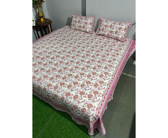 Handmade Indian Jaipuri Hand Block Printed Floral Design Double Bedsheet King Size with 2 Pillow Covers