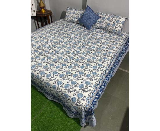 Handmade Indian Jaipuri Hand Block Printed Floral Design Double Bedsheet King Size with 2 Pillow Covers
