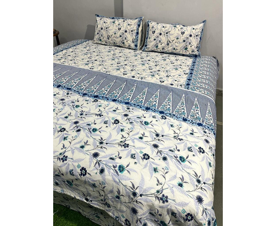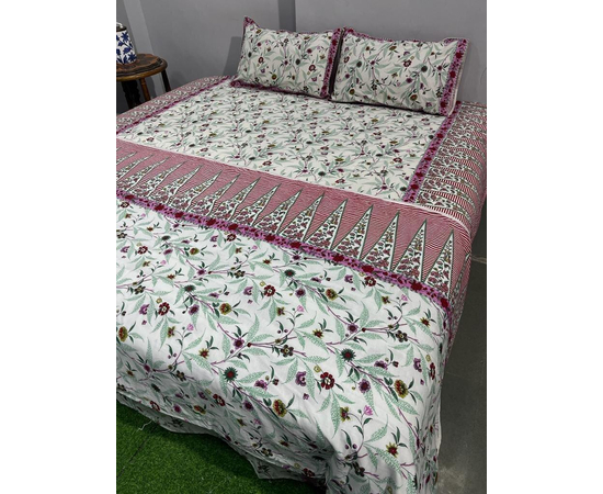 Handmade Jaipuri Block Print Double Bedsheet + Pillow Cover With Dohar Combo Set | Floral Print Double Cotton Bed Sheet