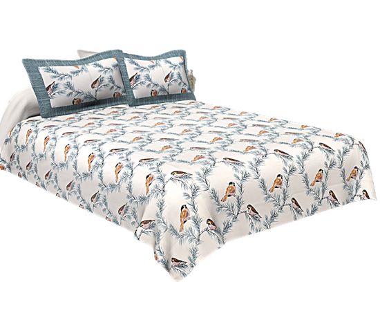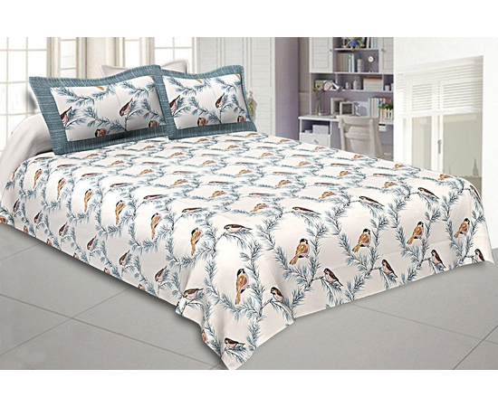 Indian Bird Blue Print Beautiful Color Bedsheet, Pure Cotton 240 TC Bedspread, Bedding, Cotton Fabric Bird Print Bedsheet With Pillow Cover