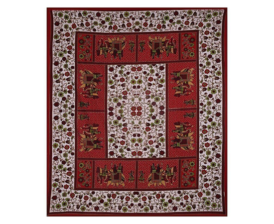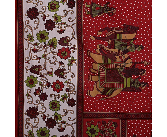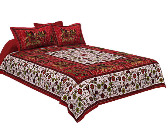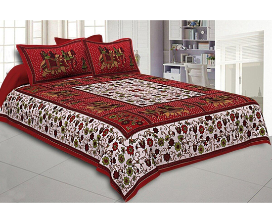 Indian Craft 100% Cotton Double Bedspread With 2 Pillow Covers, Maroon Border White Base Barat Pattern Screen Print Cotton King Size Double Bed Sheet