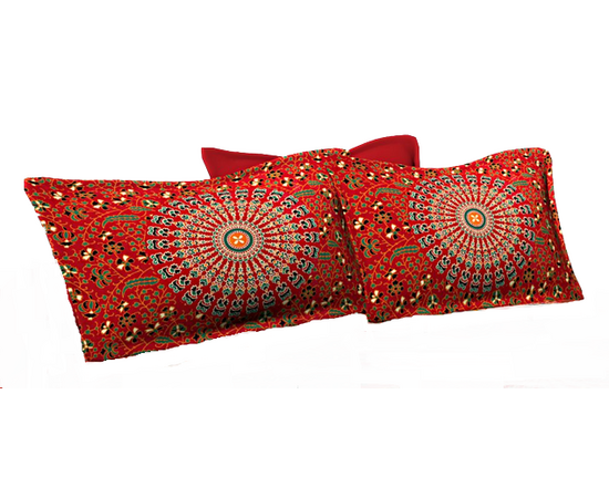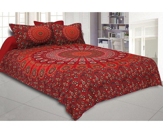 Indian Handemade Set Of 3 Red Mandala Bedsheet Tapestry Floral Print With 2 Pillow Covers, Bedding With Pillow Cover, 100% Cotton Bedsheet Throw
