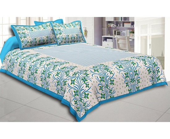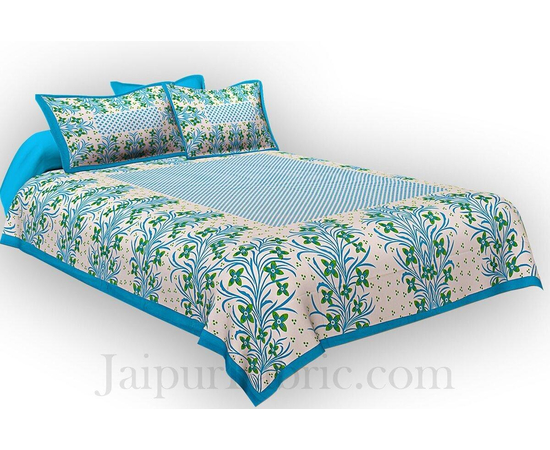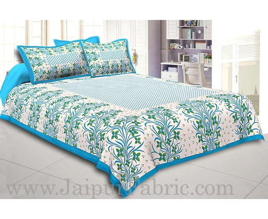 Firozi Border White Base Green Flower and Leaf Pattern Cotton Double Bedsheet Handmade Bedspread | Handmade Cotton Flat Sheets Bed sheets Bedlinen Double King size