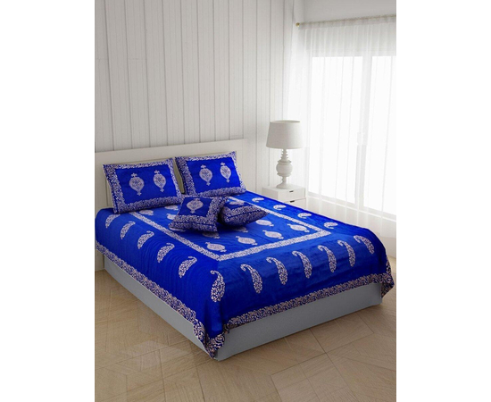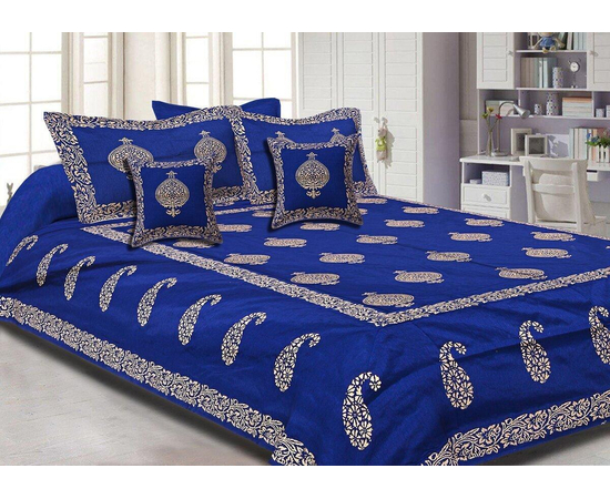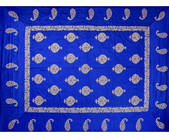 Royal Blue Paisly Border Hand Block Print Bedsheet Set, Handmade Indian Silk Bedding Set, Bedroom Decor, Khadi Golden Hand Block Work Silk Double Bedspread