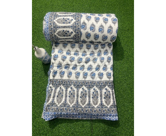 This is a famous Jaipuri handmade quilt. This quilt is made with Machine-stitched work. Kantha is a popular form of embroidery practiced by rural women. We use cotton fabric layers outside and cotton filling inside it. This comfortable soft Indian quilt with indian traditional print is perfect for all weather.