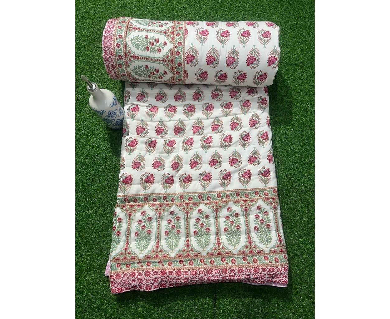 This is a famous Jaipuri handmade quilt. This quilt is made with Machine-stitched work. Kantha is a popular form of embroidery practiced by rural women. We use cotton fabric layers outside and cotton filling inside it. This comfortable soft Indian quilt with indian traditional print is perfect for all weather.