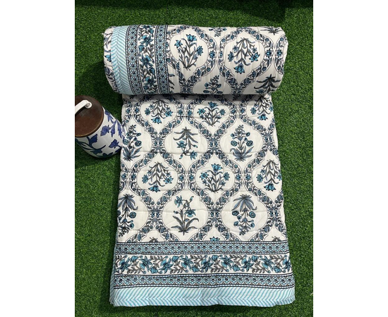This is a famous Jaipuri handmade quilt. This quilt is made with Machine-stitched work. Kantha is a popular form of embroidery practiced by rural women. We use cotton fabric layers outside and cotton filling inside it. This comfortable soft Indian quilt with indian traditional print is perfect for all weather.