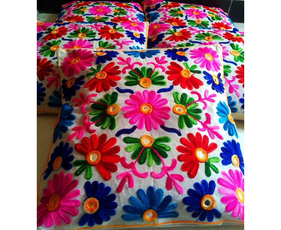 BLUE LIGHT BLUE PINK WHITE BASE CUSHION COVERS (SET OF 5)/MULTICOLOR WOOLEN THREAD EMBROIDERED COVERS/JAIPURI MIRROR EMBROIDERED CUSHION COVERS