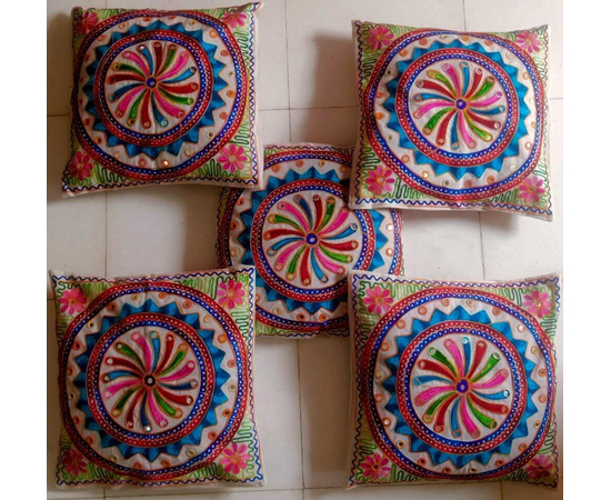 GREEN LIGHT BLUE CREAM BASE CUSHION COVERS (SET OF 5)/MULTICOLOR WOOLEN THREAD EMBROIDERED COVERS/JAIPURI MIRROR EMBROIDERED CUSHION COVERS