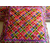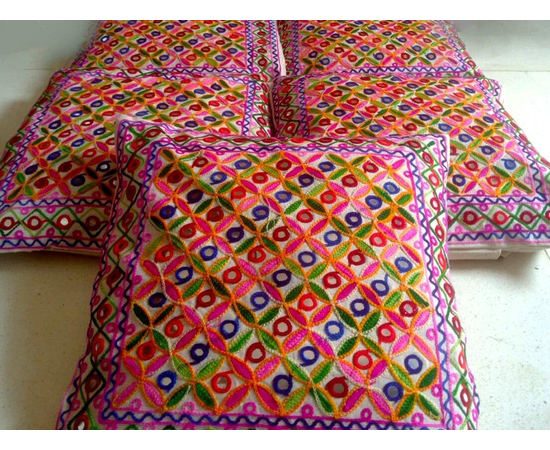 LIGHT BLUE PINK RED GREEN WHITE BASE CUSHION COVERS (SET OF 5)/MULTICOLOR WOOLEN THREAD EMBROIDERED COVERS/JAIPURI MIRROR EMBROIDERED CUSHION COVERS