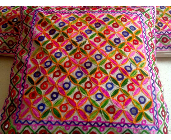 Mirror embroidery is a true reflection of the Rajasthani culture and is believed to have originated in Persia and later entered India through the Mughal Empire. The craftsmen in Rajasthan use pieces of mirrors, usually round in shape which are embroidered into pieces of cloths to render a beautiful look to the fabric. The patterns are first traced on the cloth and later the craftsmen do the embroidery using the tracing marks. The embroidery is done using beautiful threads which adds to the grace of the cushion cover. These are suitable to be used on sofas, couches, beds, in the lounges etc. By adding these to your home decor you will bring a feel of Rajasthani Culture to your home. The stylish cushion cover is 40 x 40 cm (16x16 Inches) in size and can fit a cushion of size 15 to 17 inches.