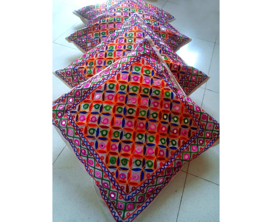 Mirror embroidery is a true reflection of the Rajasthani culture and is believed to have originated in Persia and later entered India through the Mughal Empire. The craftsmen in Rajasthan use pieces of mirrors, usually round in shape which are embroidered into pieces of cloths to render a beautiful look to the fabric. The patterns are first traced on the cloth and later the craftsmen do the embroidery using the tracing marks. The embroidery is done using beautiful threads which adds to the grace of the cushion cover. These are suitable to be used on sofas, couches, beds, in the lounges etc. By adding these to your home decor you will bring a feel of Rajasthani Culture to your home. The stylish cushion cover is 40 x 40 cm (16x16 Inches) in size and can fit a cushion of size 15 to 17 inches.