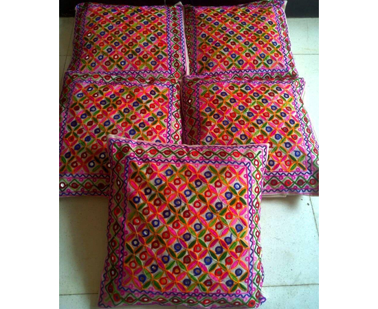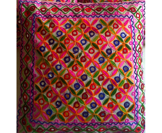 Mirror embroidery is a true reflection of the Rajasthani culture and is believed to have originated in Persia and later entered India through the Mughal Empire. The craftsmen in Rajasthan use pieces of mirrors, usually round in shape which are embroidered into pieces of cloths to render a beautiful look to the fabric. The patterns are first traced on the cloth and later the craftsmen do the embroidery using the tracing marks. The embroidery is done using beautiful threads which adds to the grace of the cushion cover. These are suitable to be used on sofas, couches, beds, in the lounges etc. By adding these to your home decor you will bring a feel of Rajasthani Culture to your home. The stylish cushion cover is 40 x 40 cm (16x16 Inches) in size and can fit a cushion of size 15 to 17 inches.