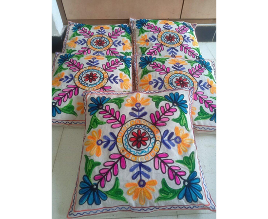 WHITE BASE PINK YELLOW BLUE CUSHION COVERS/MULTICOLOR THREAD EMBROIDERED COVERS/JAIPURI MIRROR EMBROIDERED CUSHION COVERS