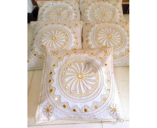 WHITE COLOUR CUSHION COVERS (5 PIECE SET)/WOOLEN THREAD EMBROIDERED COVERS/JAIPURI MIRROR EMBROIDERED CUSHION COVERS