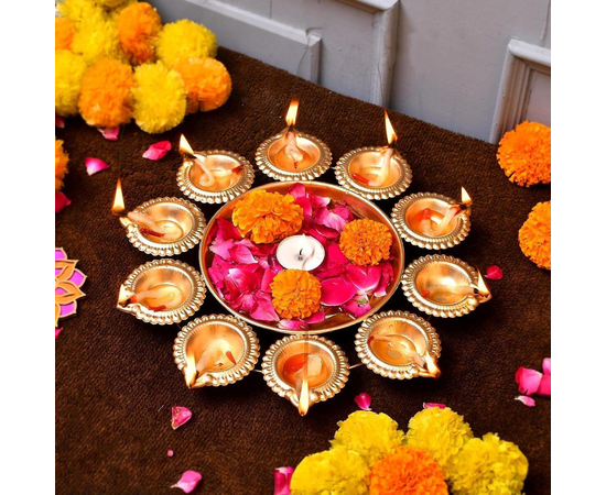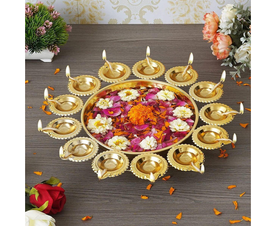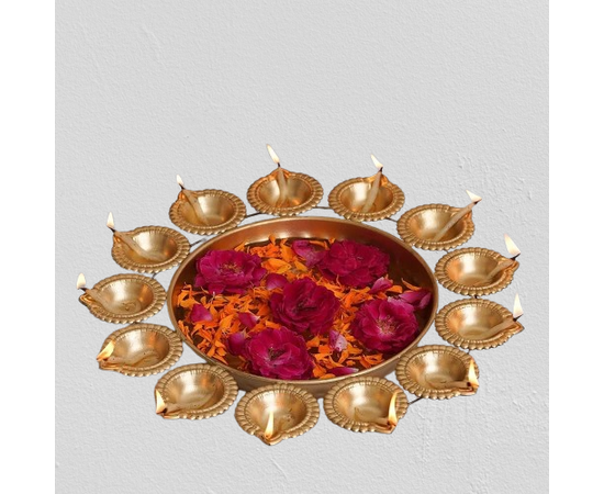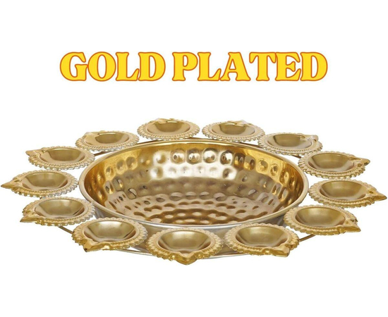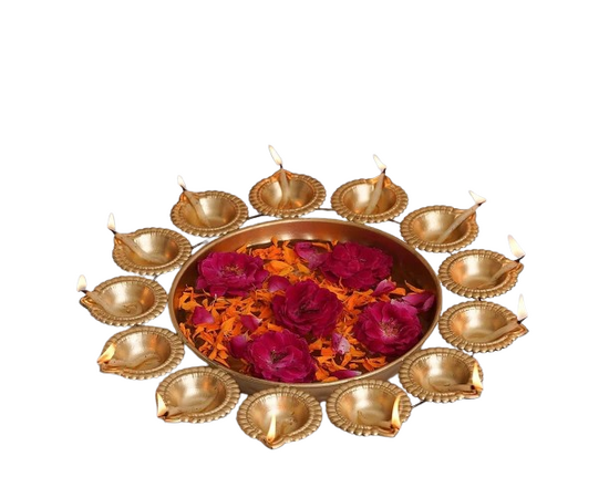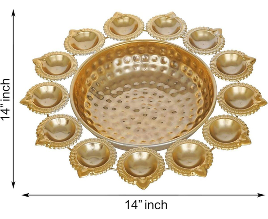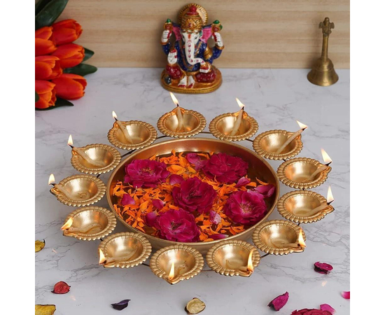 Handmade Metal Urli Bowl for Floating Flowers and Candles Urli for Home Décor Gold Round Rangoli Diya Stand 10 diya Floral urli diya