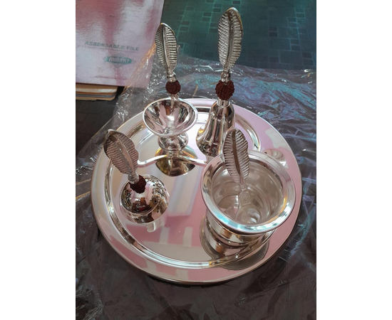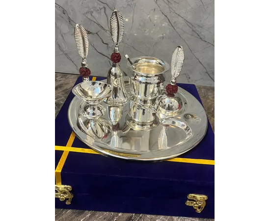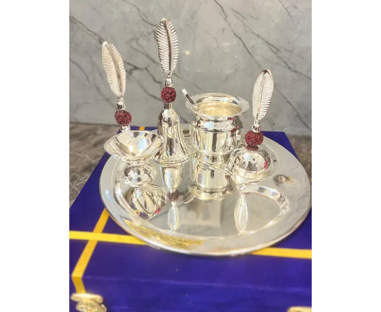 Bengalen Pooja Thali Set in Silver Plated consists of an intricately designed Pooja plate, as well as, an assortment of items necessary for performing various religious rites during auspicious occasions