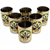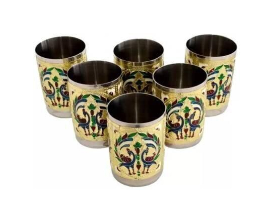 Exclusive Range of Drink ware in Stainless steel ROYAL PEACOCK DESIGNED STAINLESS STEEL MEENAKARI 4 GLASS - GOLDEN MINAKARI - TILTED HEAD (SIZE : 2.5" x 2.5" x3.67" INCHES) ## ELEGANT AND LONG-LASTING GIFT FOR ALL OCCASIONS GLASS SIZE (LxBxH): 2.5" x 2.5" x 3.67" Inches GLASS WEIGHT : 100 Grams x 4 Glasses ## INNER MATERIAL : STAINLESS STEEL OUTER MATERIAL : GOLDEN COLOURED ALUMINIUM SHEET DECORATED BY : MEENAKARI (COLORED WAX) ## Meenakari - One of the rare Indian rural craft to decorate metal surface by Meena (Coloured Wax). Most of our products are made of meenakari decoration which requires meticulous detailing, accuracy and precision. ## IDEAL CHOICE FOR : Designer Glass Set, Decorative S.S. Glass Set, Fancy Stainless Steel Glass Set, Traditional Glass Set, etc. ## NOTE : Handicraft items are prone to +/- 5% variation in size and weight. ## NOTE : Tray shown in picture is only for indication, not for sale