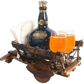 Wooden Cart Shaped 1 Wine Bottle and 2 Glass Holder Movable and Sturdy Panel Snacks Serving Platter for Dining Table | Bear Serving for Table Décor