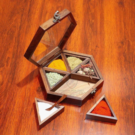 Creation India Craft Sheesham Wooden masala Box, Hexagon Shaped Spice Box, Spice Box for Kitchen with Lid and Spoon/6 containers, Pack of 1, Brown, 90 Ml