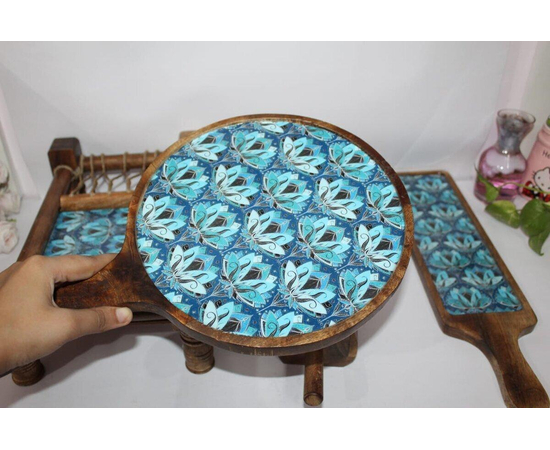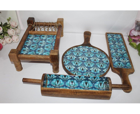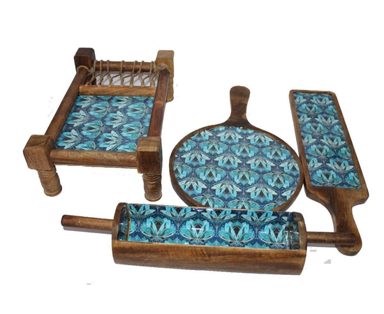 BLUE COLOR KHAT PLATTERS, HANDMADE WOODEN PLATTER, HANDMADE PLATTER FOR TABLEWARE, DINNERWARE, SERVING PLATE SET OF 4