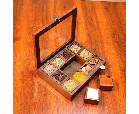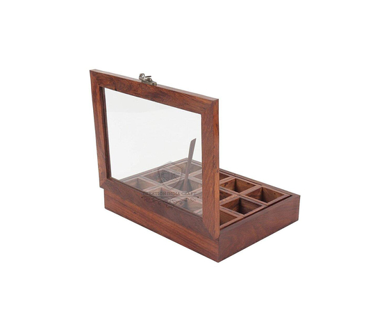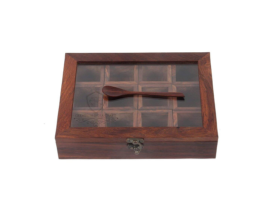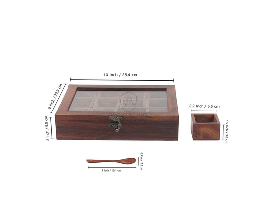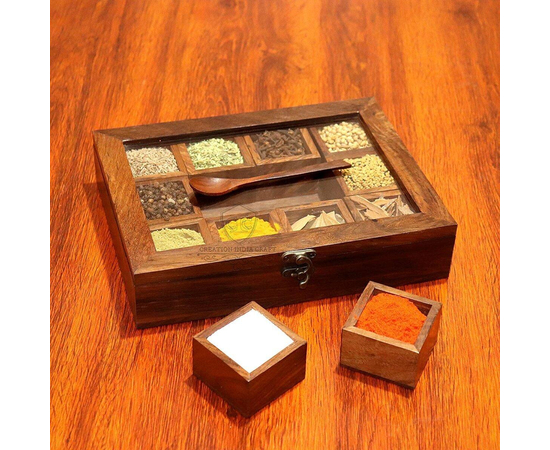 - Color: Brown, Material: Sheesham Wood, Art Type: Handcrafted | Comes with Removal Twelve Containers and a wooden spoon to hold your spices
