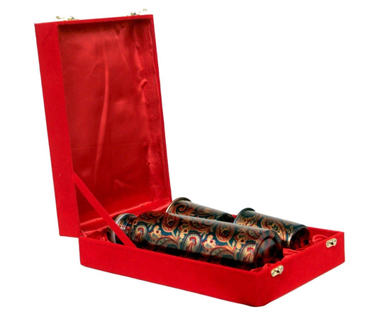 Immerse yourself in the richness of Indian heritage with our breathtaking Meenakari Copper Bottle Set. This exquisite set is a masterpiece of traditional Indian craftsmanship, showcasing the intricate art of Meenakari. Skilled artisans meticulously handcrafted each piece, ensuring a unique and exclusive ownership experience.