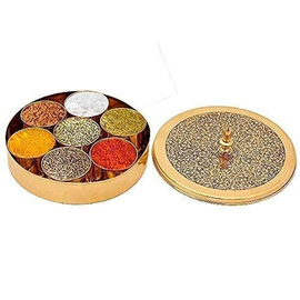 Handcrafted classic circular masala box comes with a rustic golden look and is great to store spices. The 7 different sections can be effectively used for keeping all the spices handy. This multi-utility traditional cutlery can also be used to store knick-knacks like jewellery, dry fruits or small items in one place. This spice box is a must have as your kitchen essential.