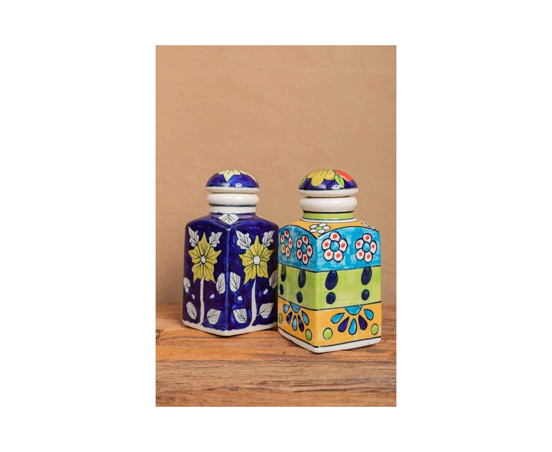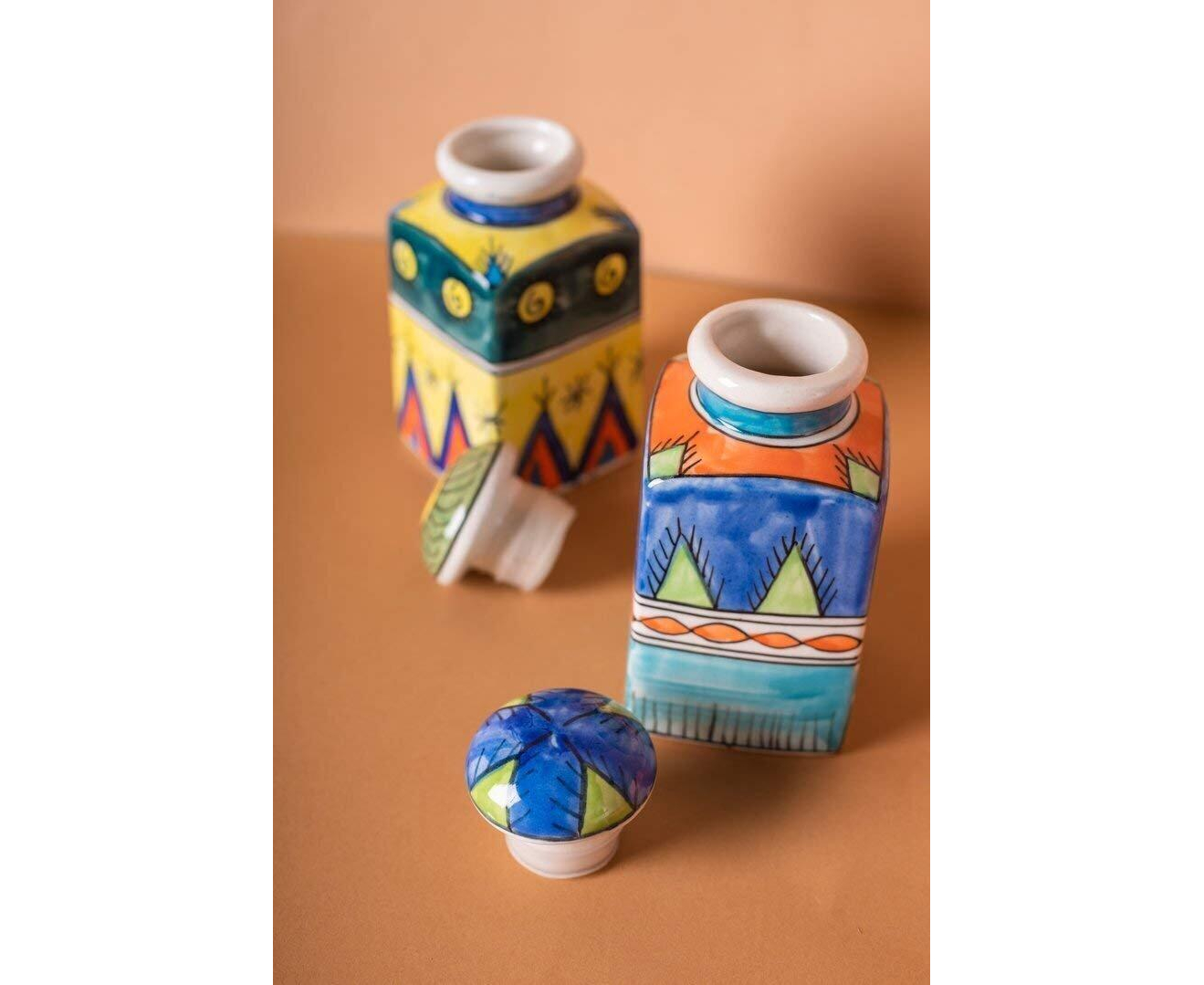 Set of 2 Multi Purpose Storage Vessel Ceramic Kitchen Food/Spice/Pickle Storage Jars with Lid for Dining Table (5 x 2.5 x 2.5 Inches, Multicolor)