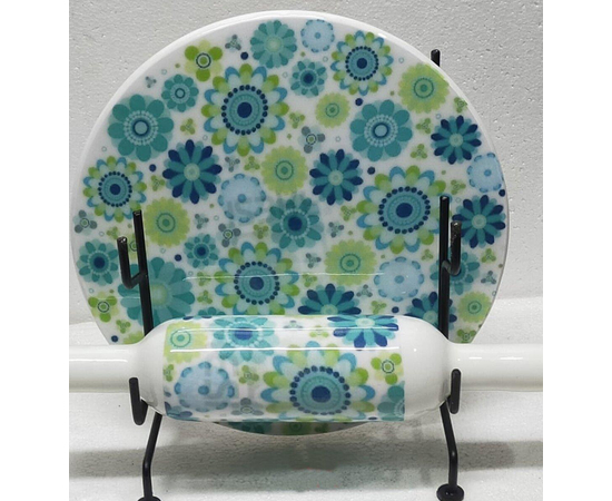 White Marble Roti Maker with Wooden Belan Enamel Print/White Marble Chakla with Belan Design, Sky Blue Printed Round shape base and Rolling Pin