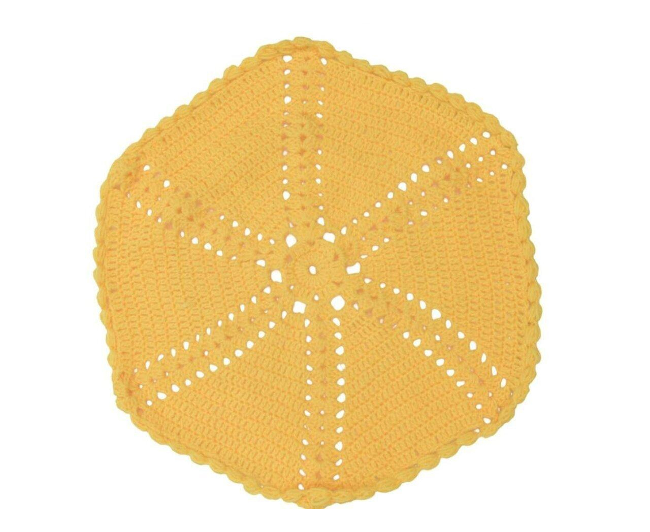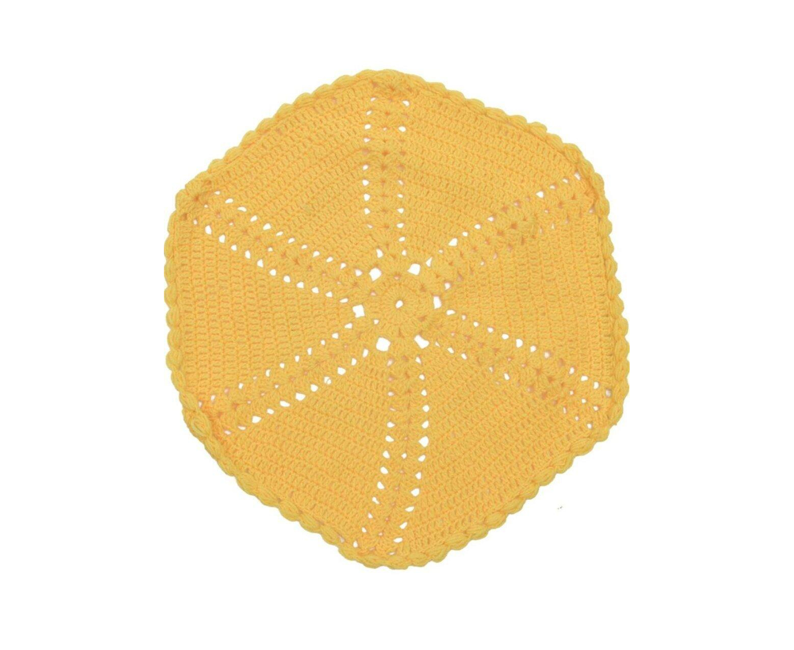 New hand-crocheted yellow doily. This beautiful, lacy doily would be an elegant centerpiece, a lovely accent for your home. This special material is strong and durable. You can see how the thread has a beautiful appearance, higher luster, deeper color penetration, and color retention. Not only does the thread seem more vibrant it will retain this look and soft elegant feel for a very long time.
