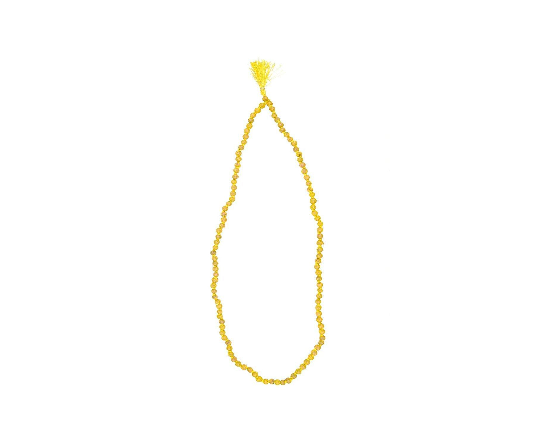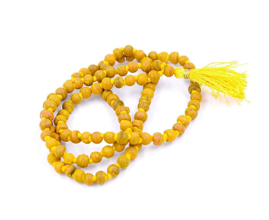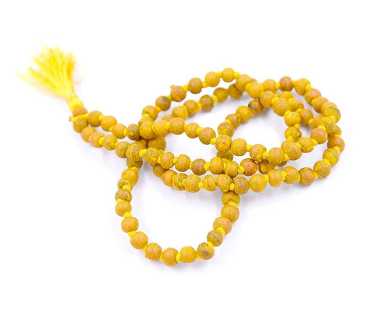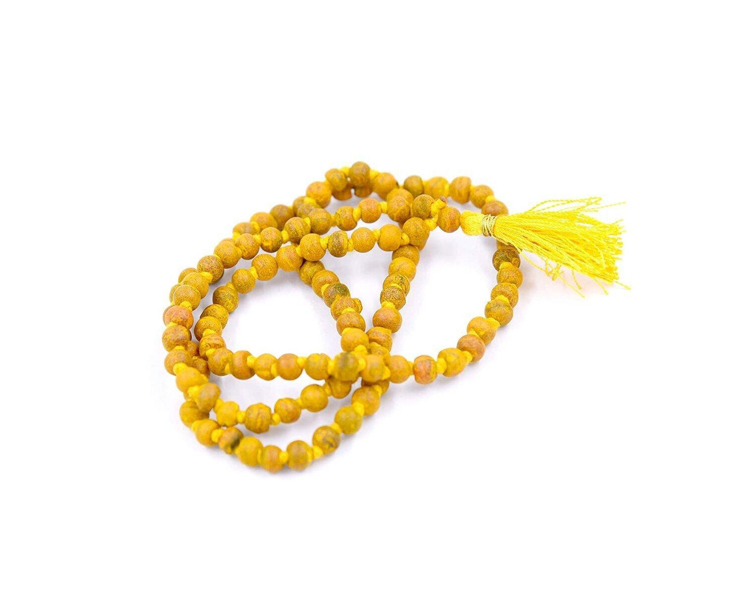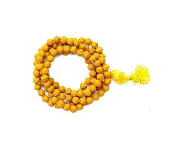 Turmeric Rosary or Haldi Mala is used to perform Anusthan (special prayers) and destroy enemies and succeed in law suits. It made of bulbs of Turmeric which is considered one of the most purifying herbs. It is used for recitation of Mantras during those worshiping ceremonies which are performed to bring success when you are in trouble because of some enemy. This Mala is specially used for chanting Mantras of Bagalamukhi and Jupiter. Haldi Mala can be used to attain victory over your enemies, the resolution of a litigation, and success in quarrels and competitions. Turmeric is considered one of the most purifying herbs in Ayurveda and is associated with fertility. One who wears this mala attains peace of mind and gets rid of anxiety, depression and tensions. The person also acquires a good amount of spiritual powers.