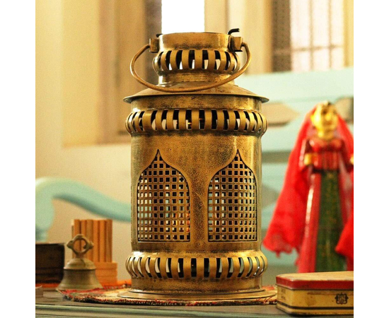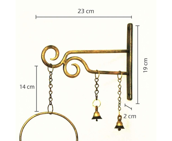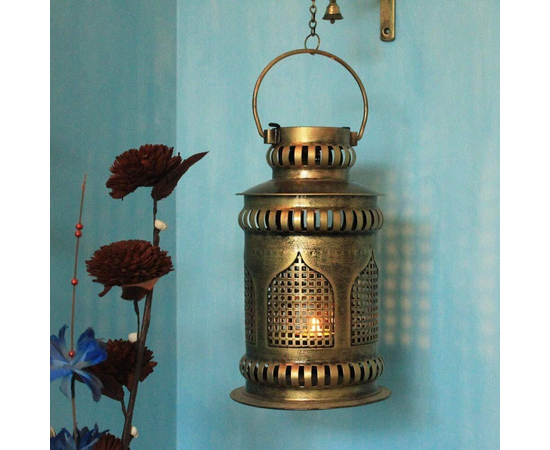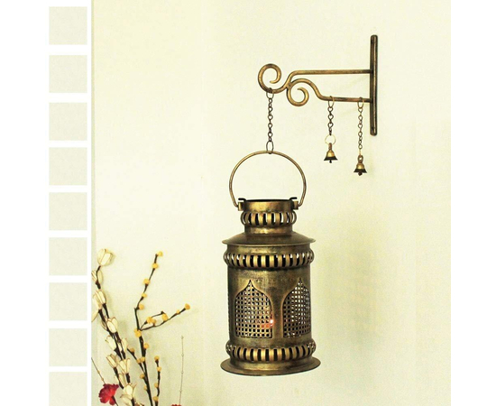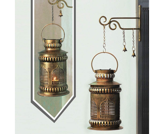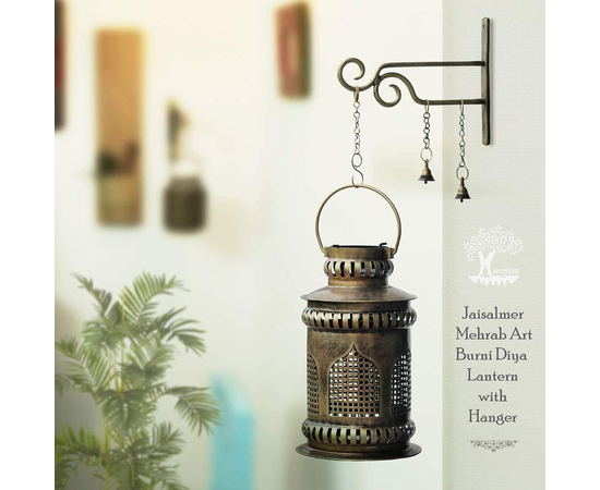- Handmade Iron Jaisalmeri Mehrab Art Burni Diya Lantern with wall-mounted hanger. An attractive combination of iron craft with brass ornaments like a Brass Chain, 2 Banarasi Bells, and Brass Diya. Wall mount Hanger and Burni Pot Lantern are made up of iron with antique finished golden chrome polish. This heritage finished piece is suitable for Meditation Room/ Poojan-Gruh Decor, Home Decor, or Spiritual Gifting. A beautiful combination of Brass and Iron Craft.