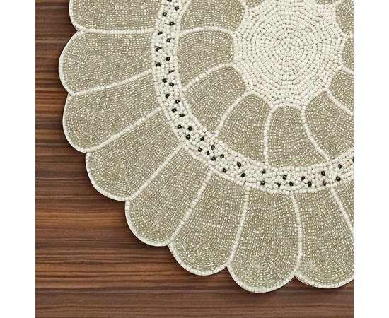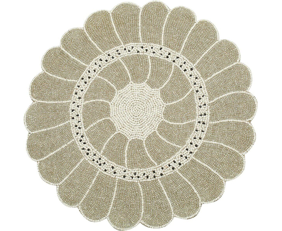 Handmade Zardozi work Beaded Placemat Set of 1 - Sunflower Design Round Hand Beaded Charger Placemat - Silver White - 14 Inch Round - Hand Made by Skilled Artisans