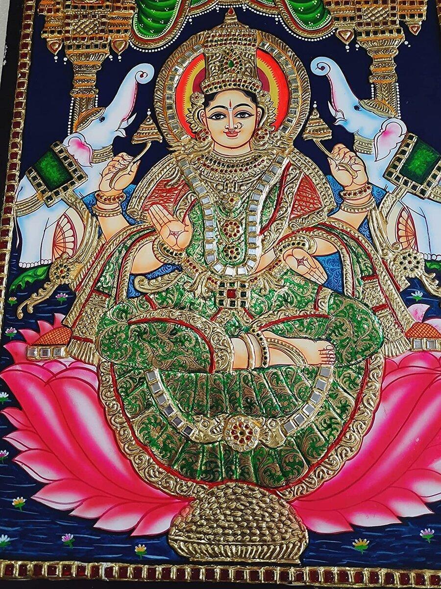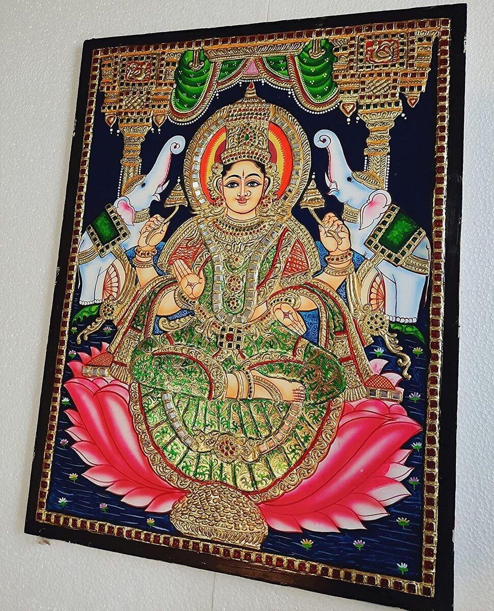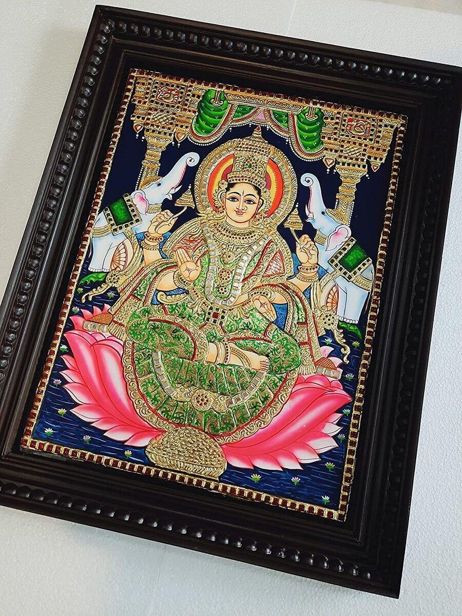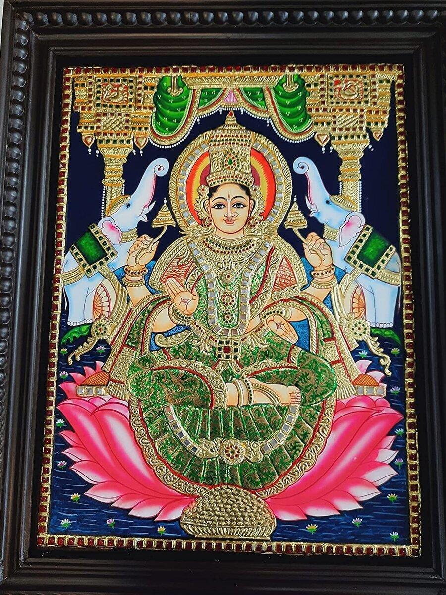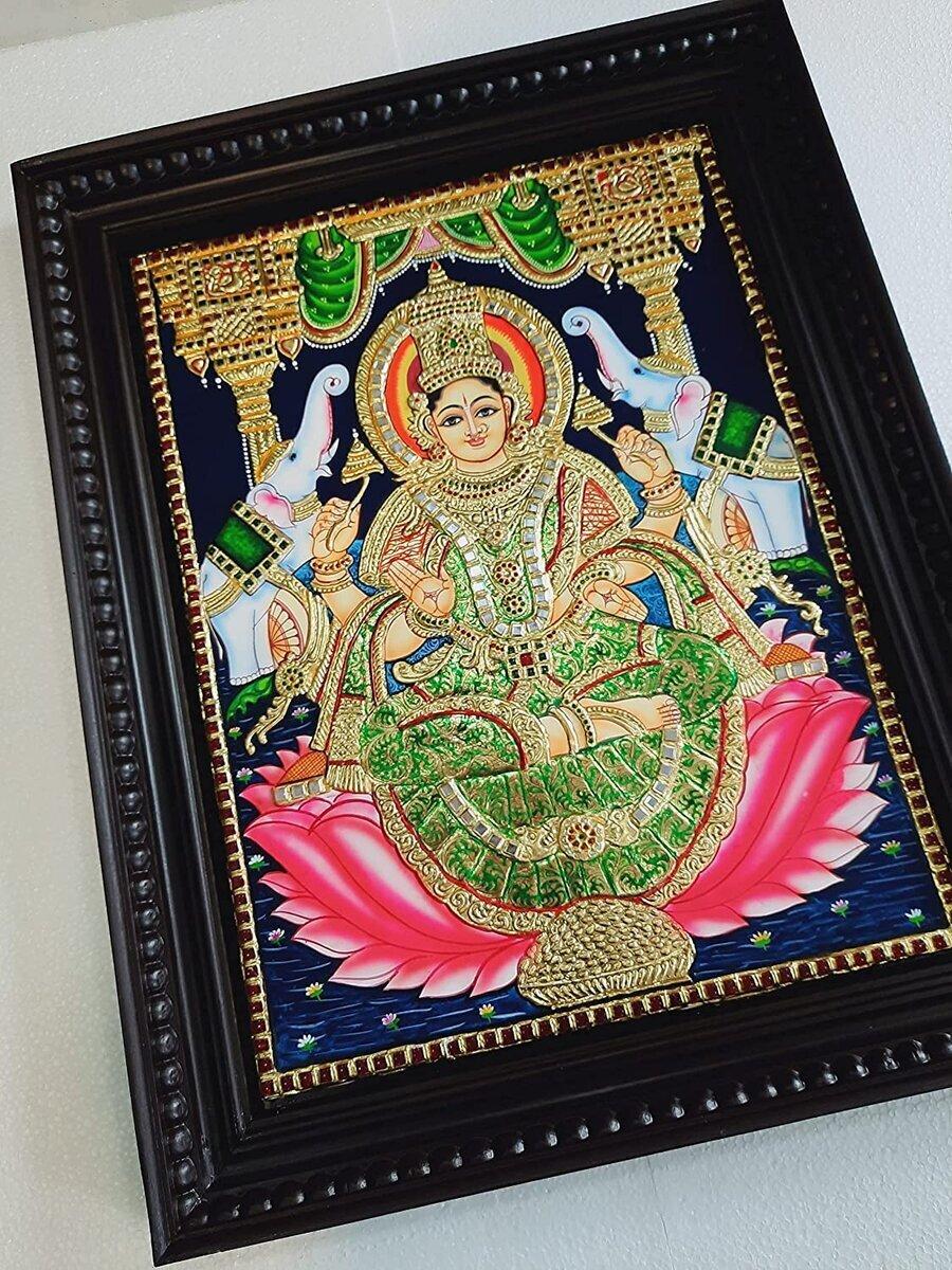 Gajalakshmi Tanjore Painting with Frame, Wealth Goddess, Gold Foils, Beautiful Painting, Indian Art, Wall Hanging, Room Decor, Gift Items