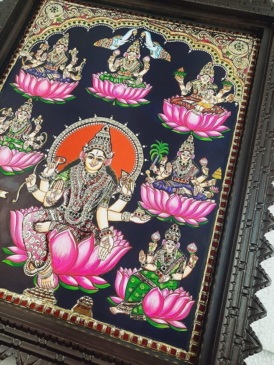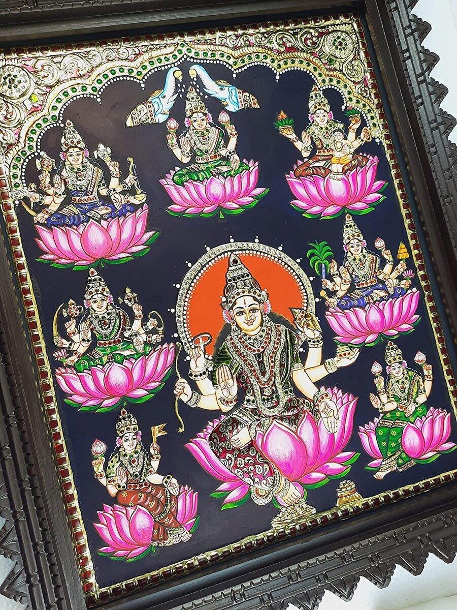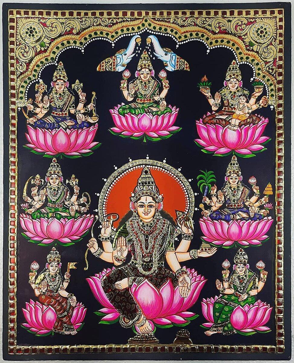 Vintage Thanjavur Painting of Ashtalakshmi, Gold Foil with Wooden Frame Tanjore Painting, 8 Forms Lakshmi, Lakshmi Tanjore Painting, Ashtalakshmi, Indian Art Gifts