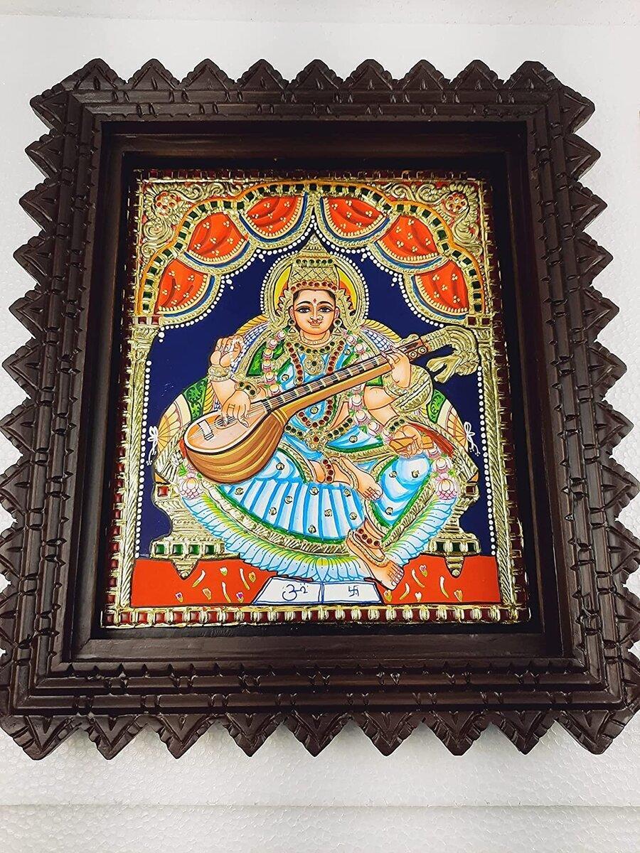 Saraswathi Tanjore Painting, Saraswathi, Wall Painting Gift Hindu Religious Goddess Tanjore Paintings for Pooja, Living Room, Bedroom
