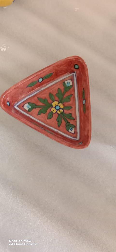 Blue Pottery Peach Color Hand painted Trays & Platters Triangular Serving Tray, Ceramic Platter, Floral Design Snack Serving Tray, Handmade Pottery Tray Size 4X4 Inches