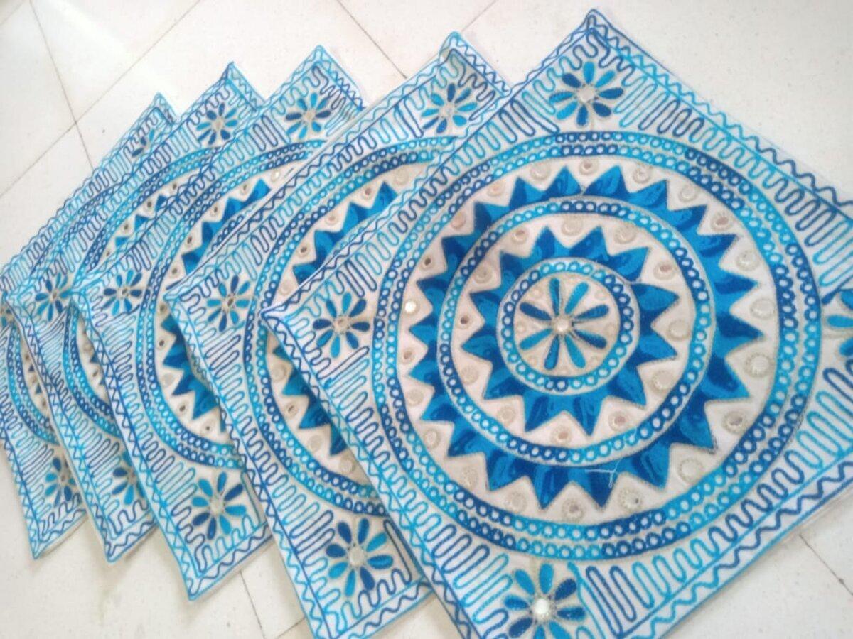WHITE BASE SKY BLUE CUSHION COVERS SET OF 5/THREAD EMBROIDERED COVERS/JAIPURI MIRROR EMBROIDERED CUSHION COVERS