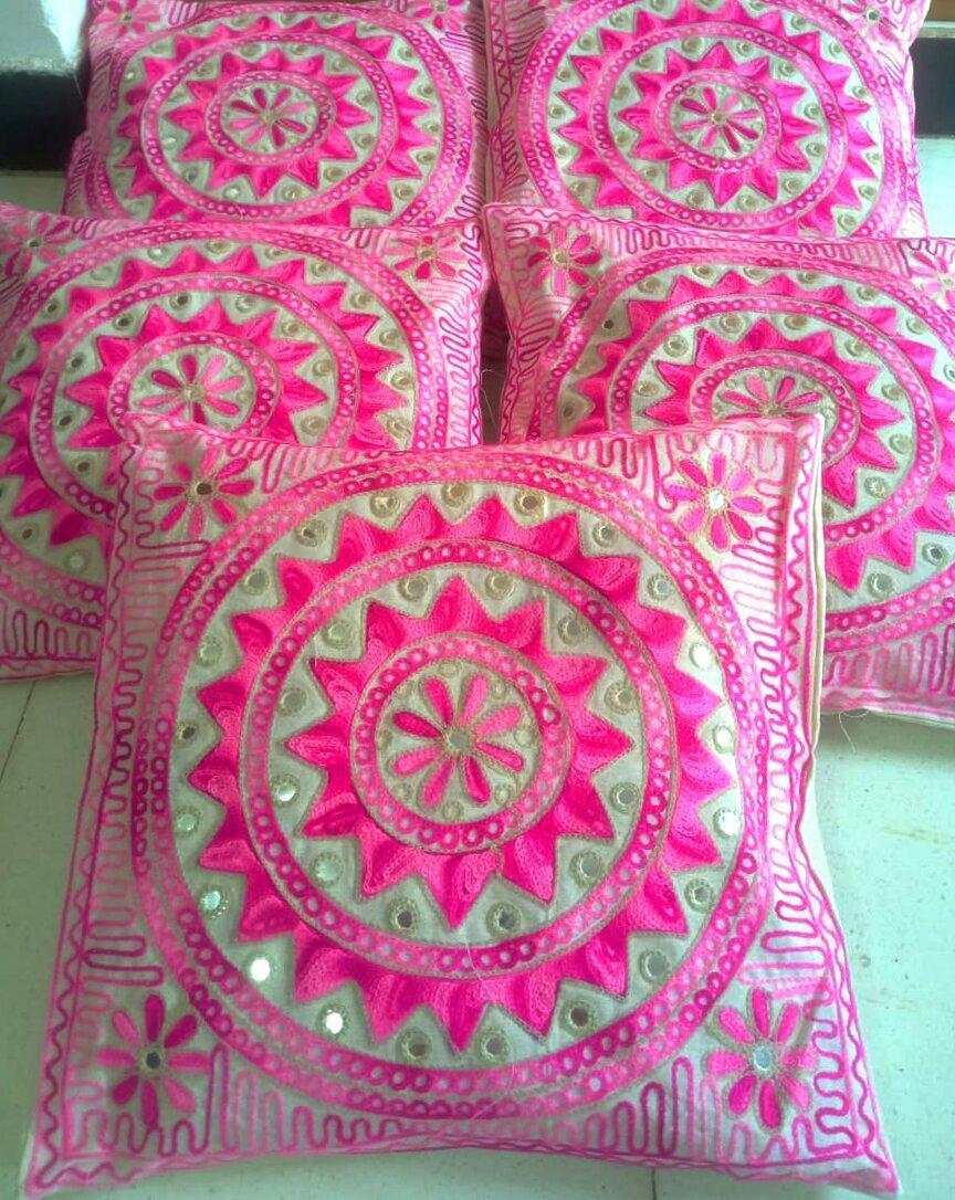 PINK GREEN WHITE BASE CUSHION COVERS (SET OF 5)/MULTICOLOR WOOLEN THREAD EMBROIDERED COVERS/JAIPURI MIRROR EMBROIDERED CUSHION COVERS