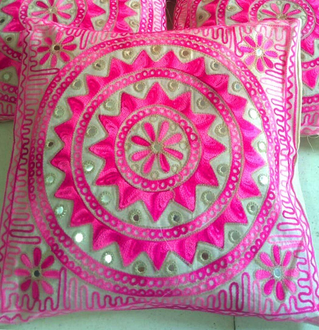 Mirror embroidery is a true reflection of the Rajasthani culture and is believed to have originated in Persia and later entered India through the Mughal Empire. The craftsmen in Rajasthan use pieces of mirrors, usually round in shape which are embroidered into pieces of cloths to render a beautiful look to the fabric. The patterns are first traced on the cloth and later the craftsmen do the embroidery using the tracing marks. The embroidery is done using beautiful threads which adds to the grace of the cushion cover. These are suitable to be used on sofas, couches, beds, in the lounges etc. By adding these to your home decor you will bring a feel of Rajasthani Culture to your home. The stylish cushion cover is 40 x 40 cm (16x16 Inches) in size and can fit a cushion of size 15 to 17 inches.