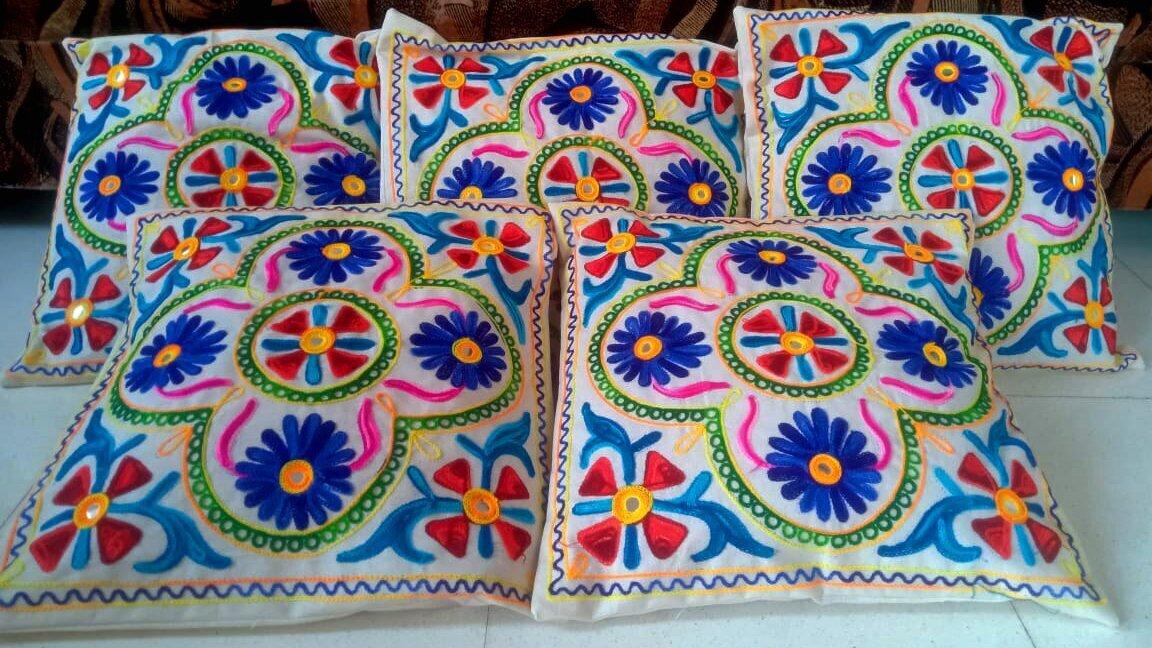 LIGHT BLUE RED YELLOW WHITE BASE CUSHION COVERS (SET OF 5)/MULTICOLOR WOOLEN THREAD EMBROIDERED COVERS/JAIPURI MIRROR EMBROIDERED CUSHION COVERS