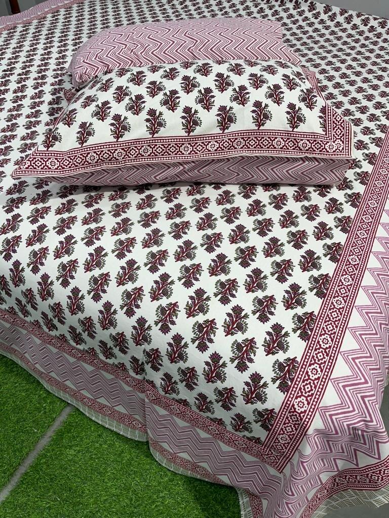 Handmade Jaipuri Hand Block Printed Floral Design Double Bedsheet King Size with 2 Pillow Covers