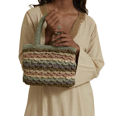 This charming metallic multi-hued crochet small handheld bag has sturdy cord handles and secure zip closure, layered with scallop detailing.