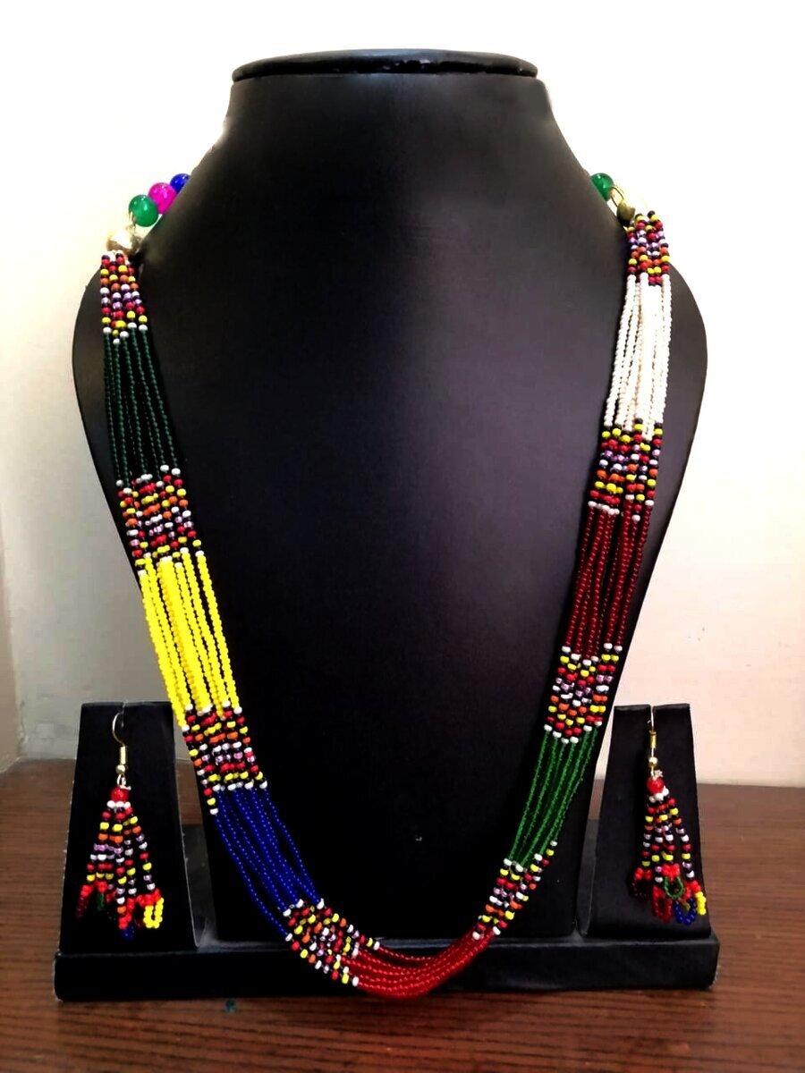 This necklace is an exquisite piece of jewelry which cannot go unnoticed from fashion jewelry lovers. this unique piece is made of multiple layers of different color beads, each one is reflecting a beauty of its own. This necklace comes along with matching pair of earrings. This exclusively gorgeous necklace will surely make you a center of attraction at any occasion. This stunning and funky piece of jewelry is your one stop destination for making any given day an occasion. We understand that your jewels are more than just accessories .They are an extension of your personality. This necklace is not only beautiful in its look but also sturdy in nature as it is made by our talented and dedicated craftsmen. Order online with 100% satisfaction guaranteed. Perfect wear for any occasions.