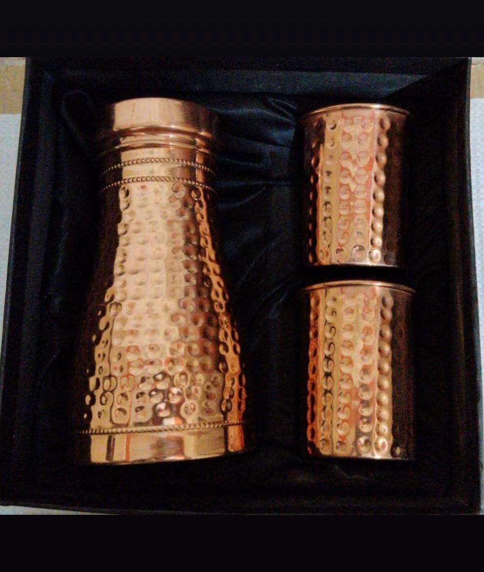 Elevate your bedtime routine with our exquisite, 100% pure hammered copper bedroom bottle, paired with two elegant glass tumblers. This stunning set combines traditional craftsmanship with modern design, ensuring a luxurious hydration experience.