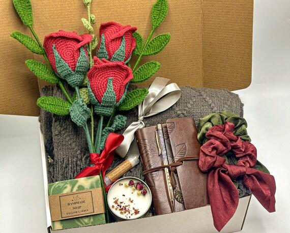 This gift box includes a rose crochet bouquet, a cozy soft blanket, a vegan leather journal with an amethyst chips pen, handmade soap, vanilla lip balm a 4-ounce soy candle, and two silk scrunchies.