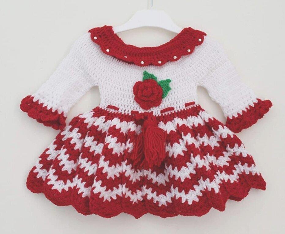 Baby crochet Dress - Christmas Outfit for baby Girls - cute infant frock - Handmade party wear frock - red white crochet frock -Crocheted red & white frock cap booties